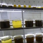 The farm has its own hatchery – more and more farms are establishing hatcheries to ensure strong and selected stock rather than rely on wild spat. New stock is bred from selected oysters, reared in carefully clean conditions. Everyone at the farm washes hands, removes shoes and washes feet and some wear masks to work in the hatchery. New-born larvae are free swimming, then at 10 days the microscopically small oysters become spats and grab onto helpful ropes to grow on.