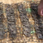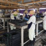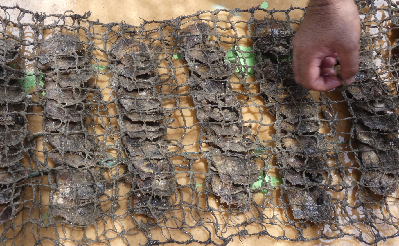 When time comes for harvest the long baskets are collected and taken ashore, where the oysters are taken out of the baskets. The oysters will have been in the open sea for between a few months for the ones with four 1.3mm nuclei (this pearl farm is thought to be the only farm in the world producing such tiny pearls) to closer to a year for what will be 7mm up round classic pearls